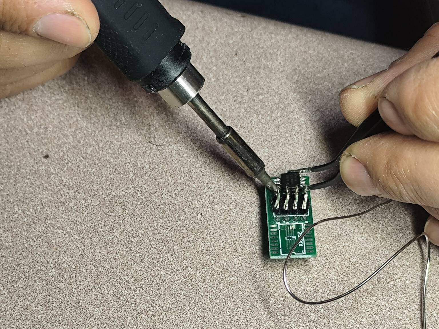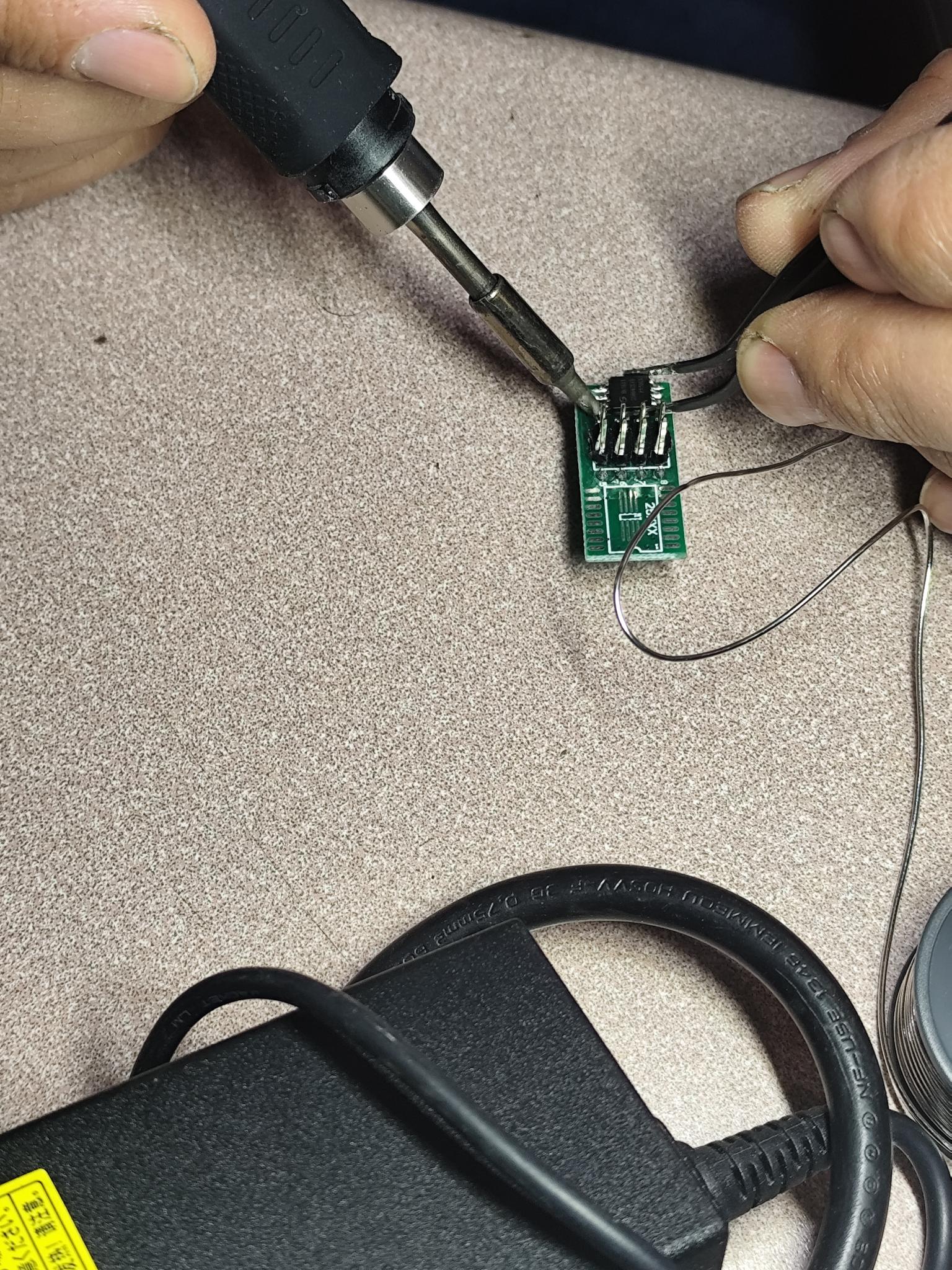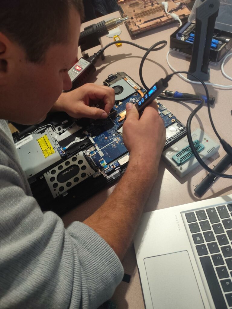 L’opération est délicate et se décompose en plusieurs étapes. On commence par dessouder l’EEPROM de la carte mère : avec un fer à souder on rajoute un peu d’étain sur les contacts de la puce électronique pour faire baisser le point de fusion de l’étain utilisé par le constructeur et dessouder la puce plus facilement. Ensuite on utilise un pistolet à air chaud qui va liquéfier l’étain sur l’ensemble des contacts de la puce et pouvoir l’enlever en une seule opération. On ressoude alors la puce sur un étrier pour l’insérer dans un programmateur d’EEPROM. On fait une copie du BIOS qui déraille, au cas où.